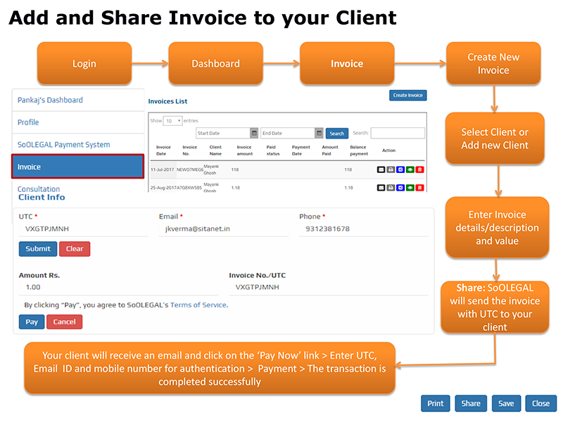 Unauthorised & improper invoicing: REGISTERED USERS must ensure that the tax invoice is raised in the name of the end customer who has placed an order with them through SoOLEGAL Payment Systems platform . The tax invoice should not mention SoOLEGAL as either a REGISTERED USER or a customer/buyer. Please note that all Documents/ Advices listed on SoOLEGAL.com are sold by the respective REGISTERED USERS to the end customers and SoOLEGAL is neither a buyer nor a REGISTERED USER in the transaction. REGISTERED USERS need to include the PAN/ Service Tax registration number in the invoice.